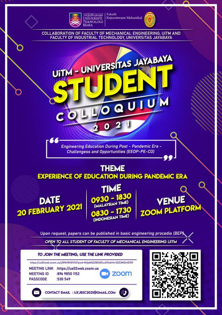 2. Sukacita dimaklumkan Majlis Perwakilan Pelajar (MPP) Fakulti Kejuruteraan Mekanikal Universiti Teknologi MARA (UiTM) ingin menjemput YBhg. Datuk / Datin/ Prof. / Dr. / Tuan / Puan untuk bersama-sama menyertai program STUDENT COLLOQUIUM 2021 UiTM - UNIVERSITAS JAYABAYA secara virtual pada butiran seperti berikut :