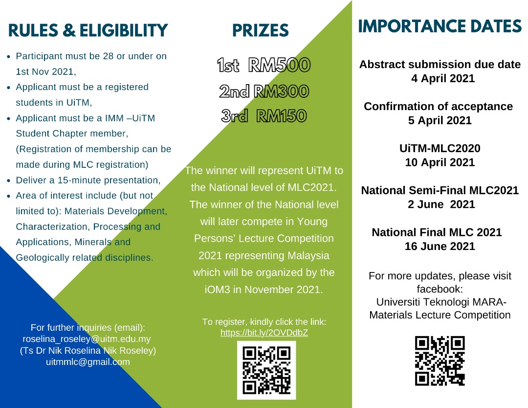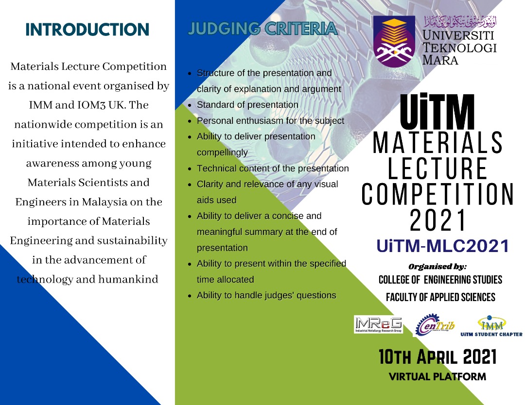 Archive 17 March 2021 Assalamualaikum and Good Morning, Calling for participants for UiTM-Materials Lecture Competition 2021. Thank you.