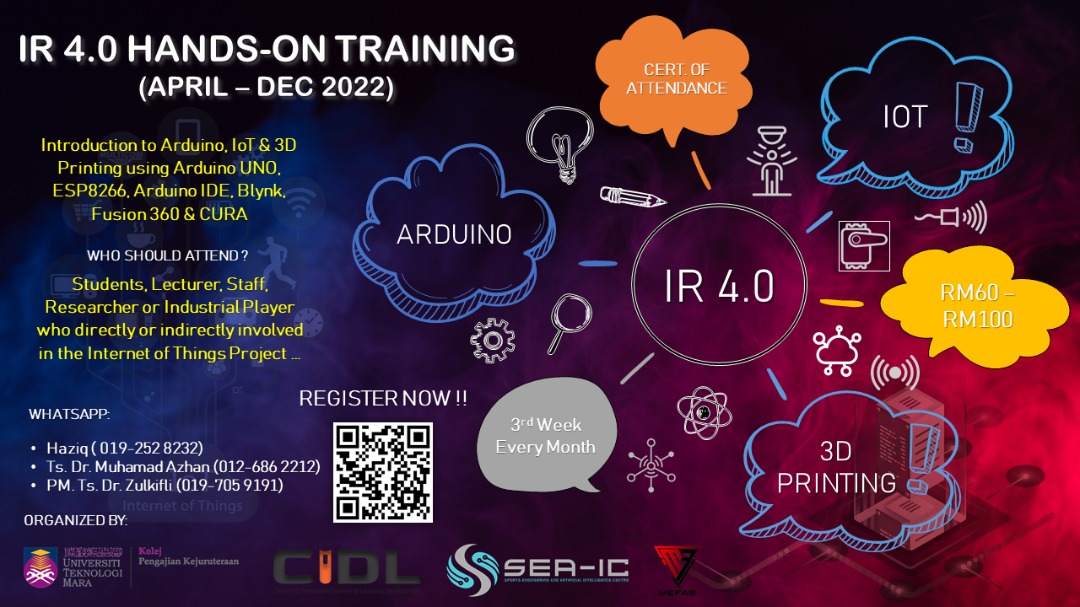 Sports Engineering & Artificial Intelligence Centre (SEA-IC), Business Development Unit (BDU) College of Engineering UiTM, Centre for Innovative Delivery and Learning Development (CIDL) & MEFAS will be conducting a series of Internet of Things hands-on Training in 2022. The program details are as follow:
