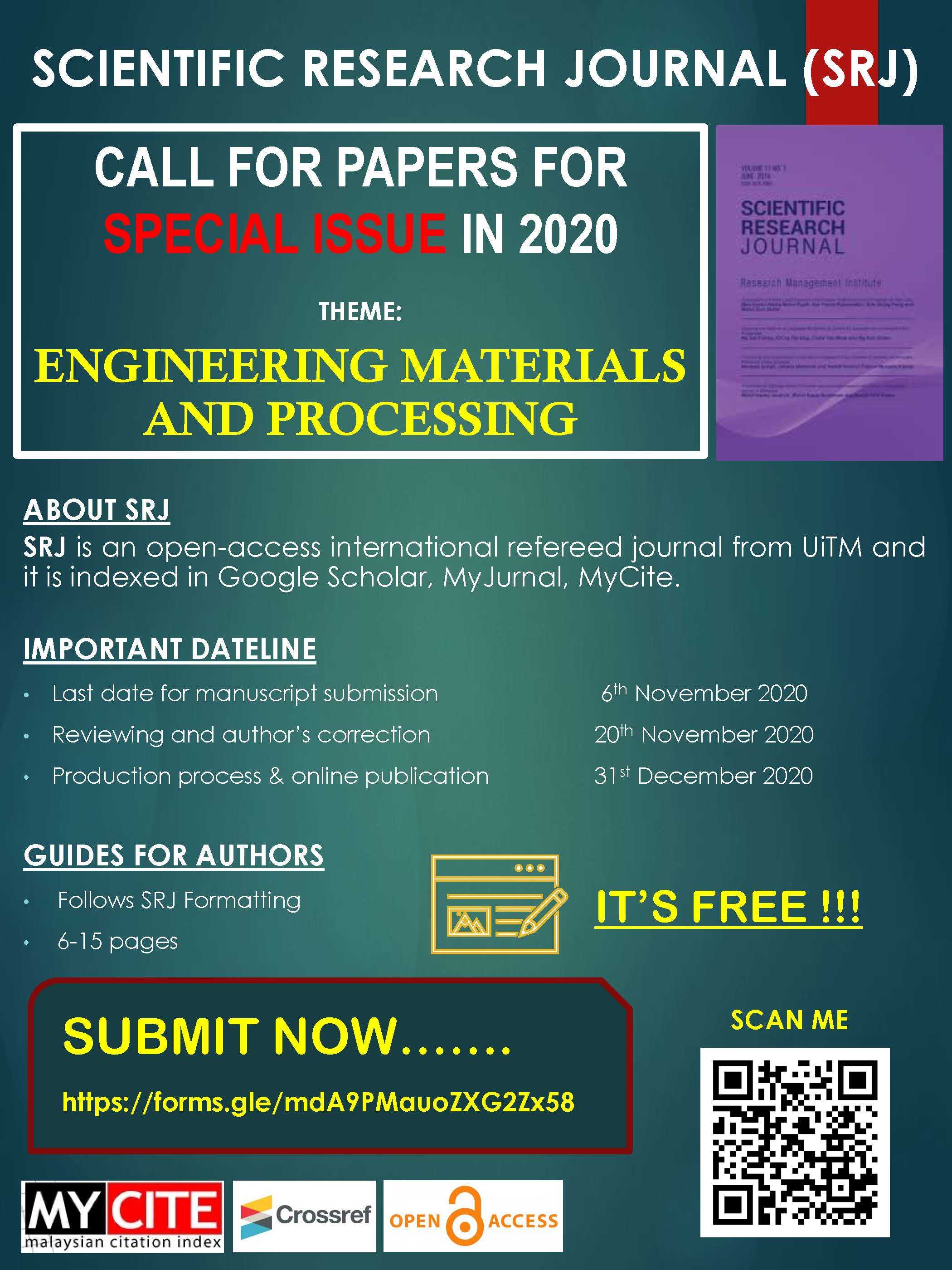 We are looking for publication in 2020 in a Special Issue in SCIENTIFIC RESEARCH JOURNAL, UiTM (My Cite Indexed, My Jurnal, Google Index).